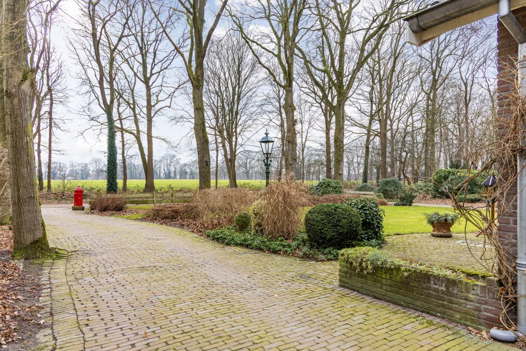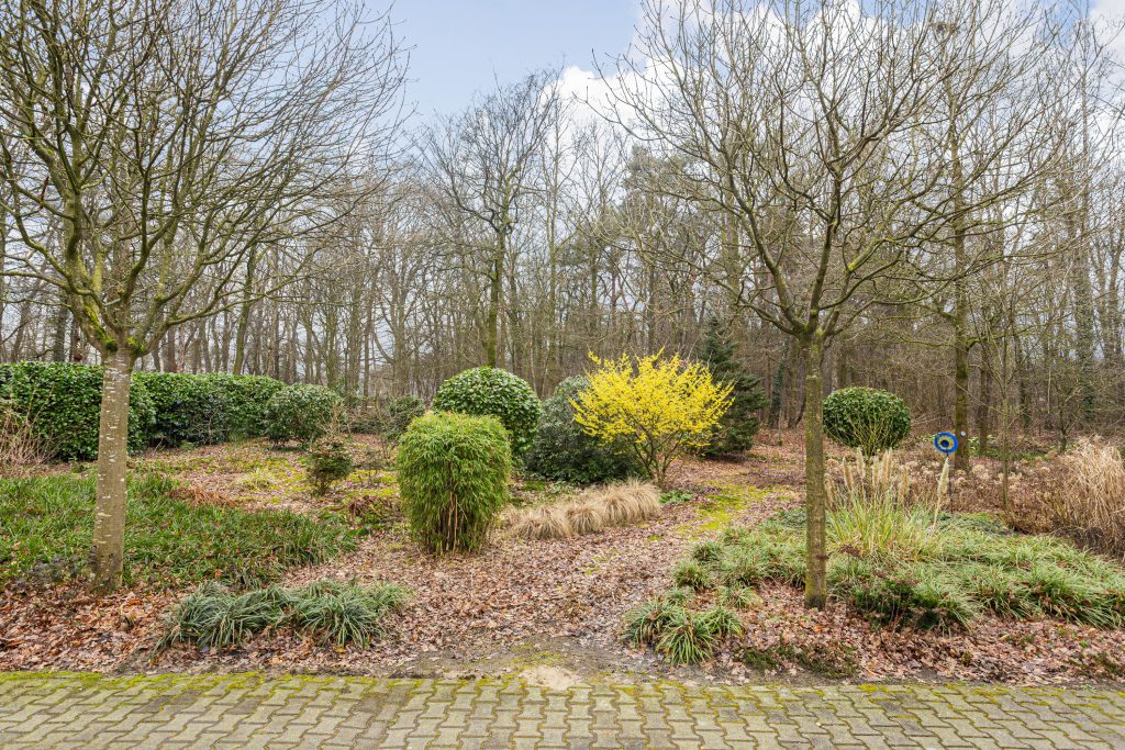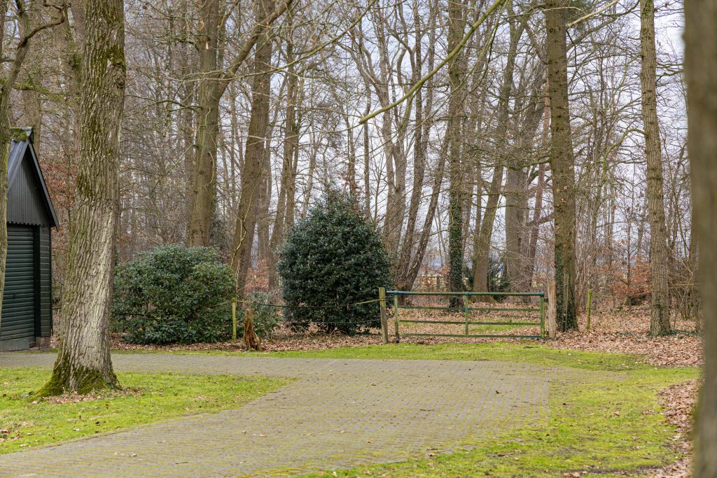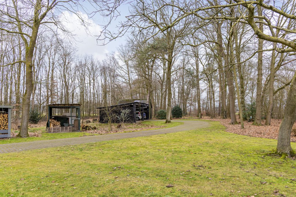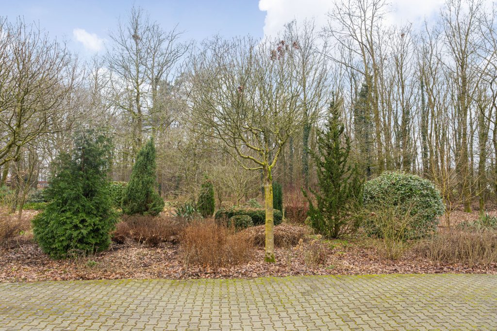 De ruimte rondom het woonhuis is ruim en groen met veel privacy. Het perceel wordt omringd door volwassen bomen, de tuin is met zorg aangelegd met veel groene en bloeiende struiken en planten. De grote gazons en diverse terrassen bieden op elk moment van de dag een fijne plek in de zon of juist in de schaduw. De ruime oprit biedt ruim voldoende parkeergelegenheid op eigen terrein.