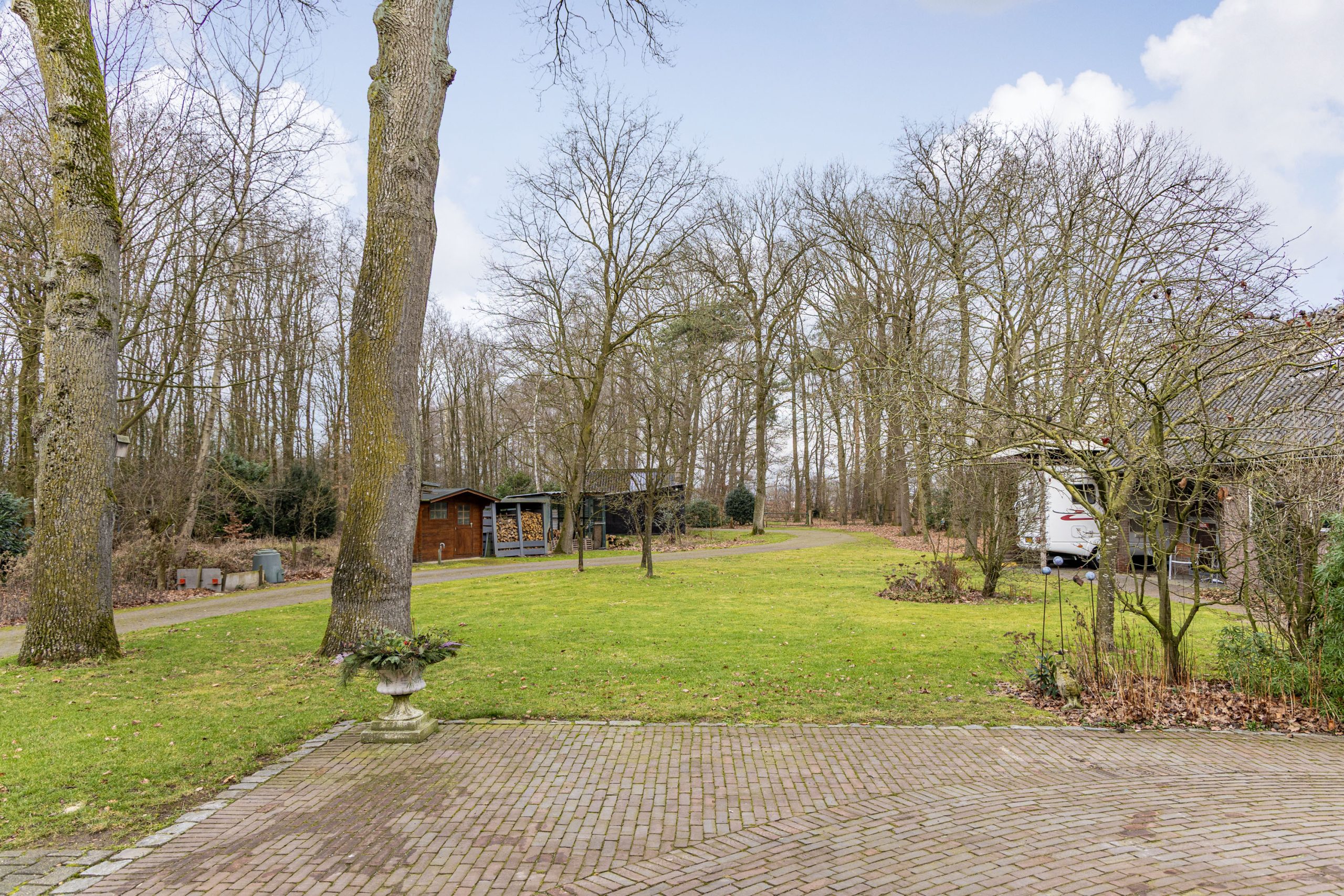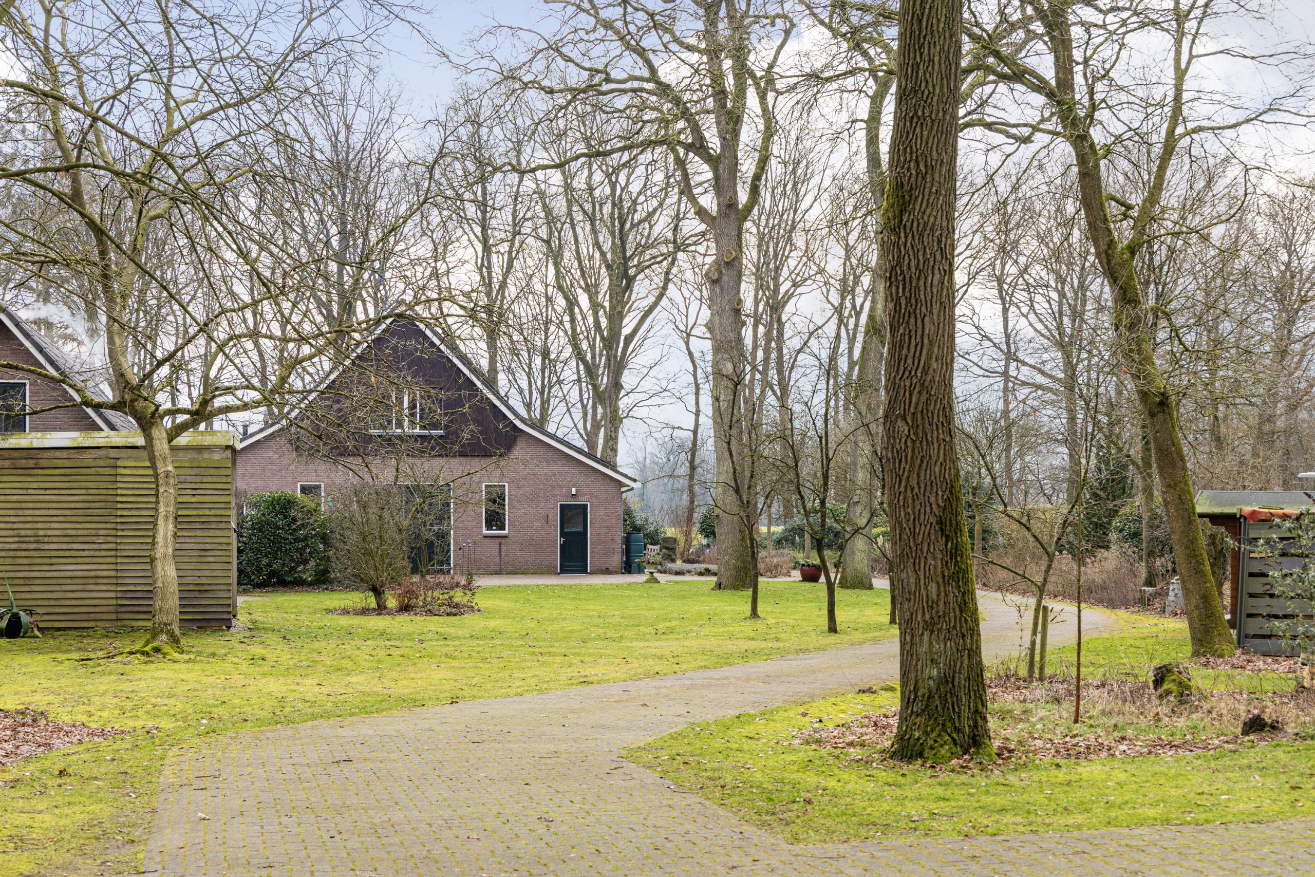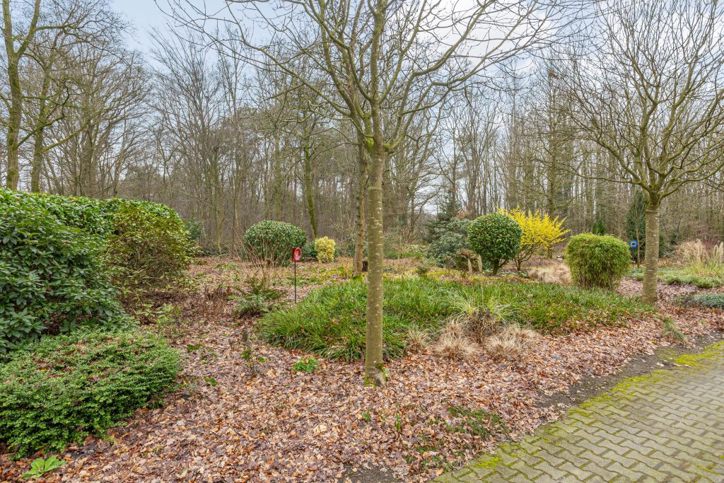 De ruimte rondom het woonhuis is ruim en groen met veel privacy. Het perceel wordt omringd door volwassen bomen, de tuin is met zorg aangelegd met veel groene en bloeiende struiken en planten. De grote gazons en diverse terrassen bieden op elk moment van de dag een fijne plek in de zon of juist in de schaduw. De ruime oprit biedt ruim voldoende parkeergelegenheid op eigen terrein.
