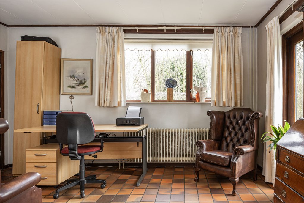 Aangrenzend aan de living bevindt zich via een open verbinding een kantoorruimte, ideaal voor thuiswerken. De keuken is uitgerust met een inbouwkeuken met diverse inbouwapparatuur en biedt ruimte voor een klein gezelschap. Voor grotere diners is de ruimte tussen keuken en de living bijzonder geschikt.